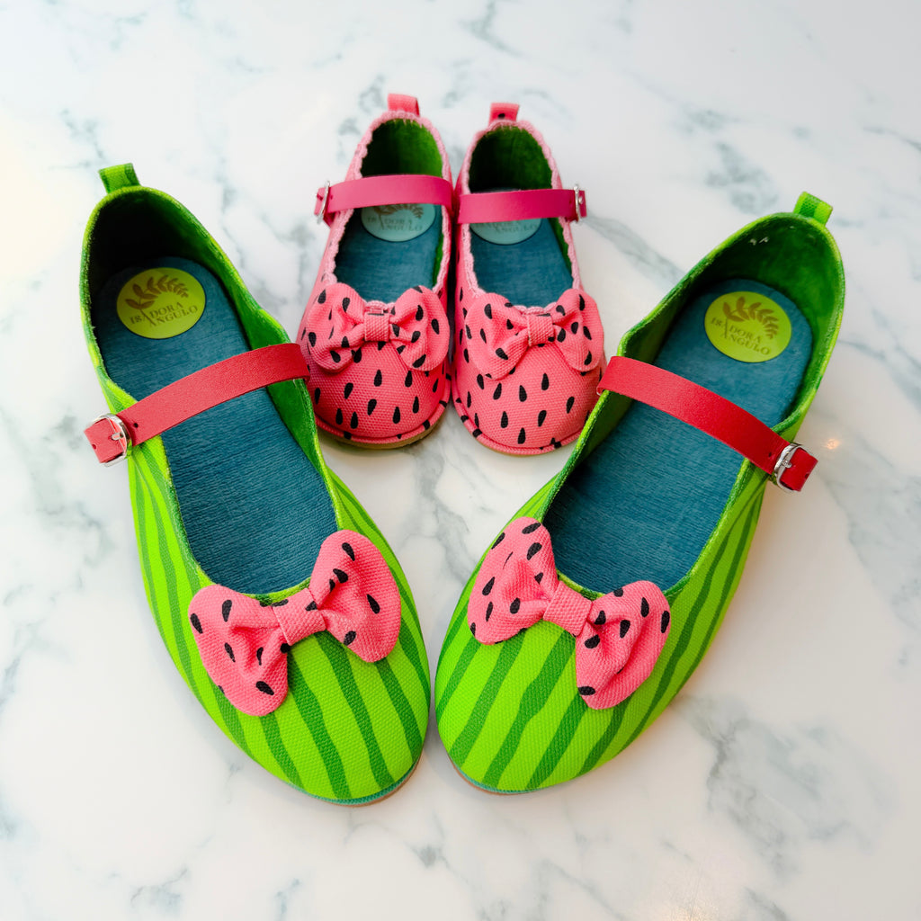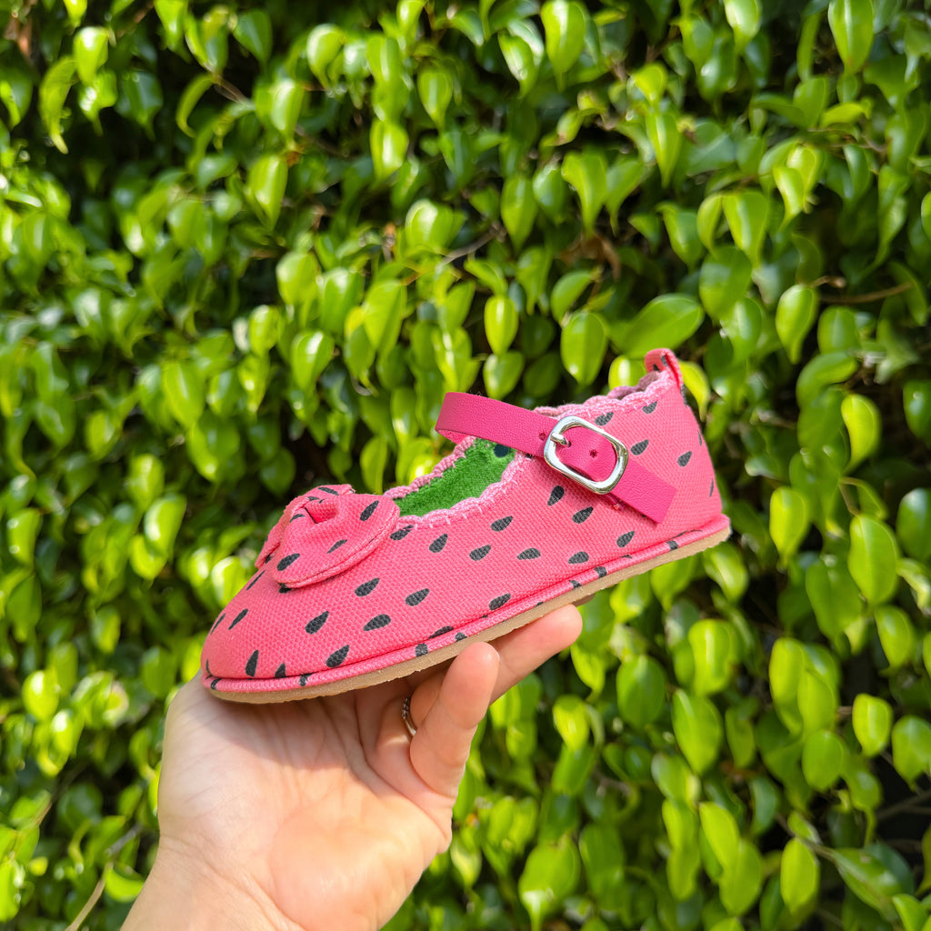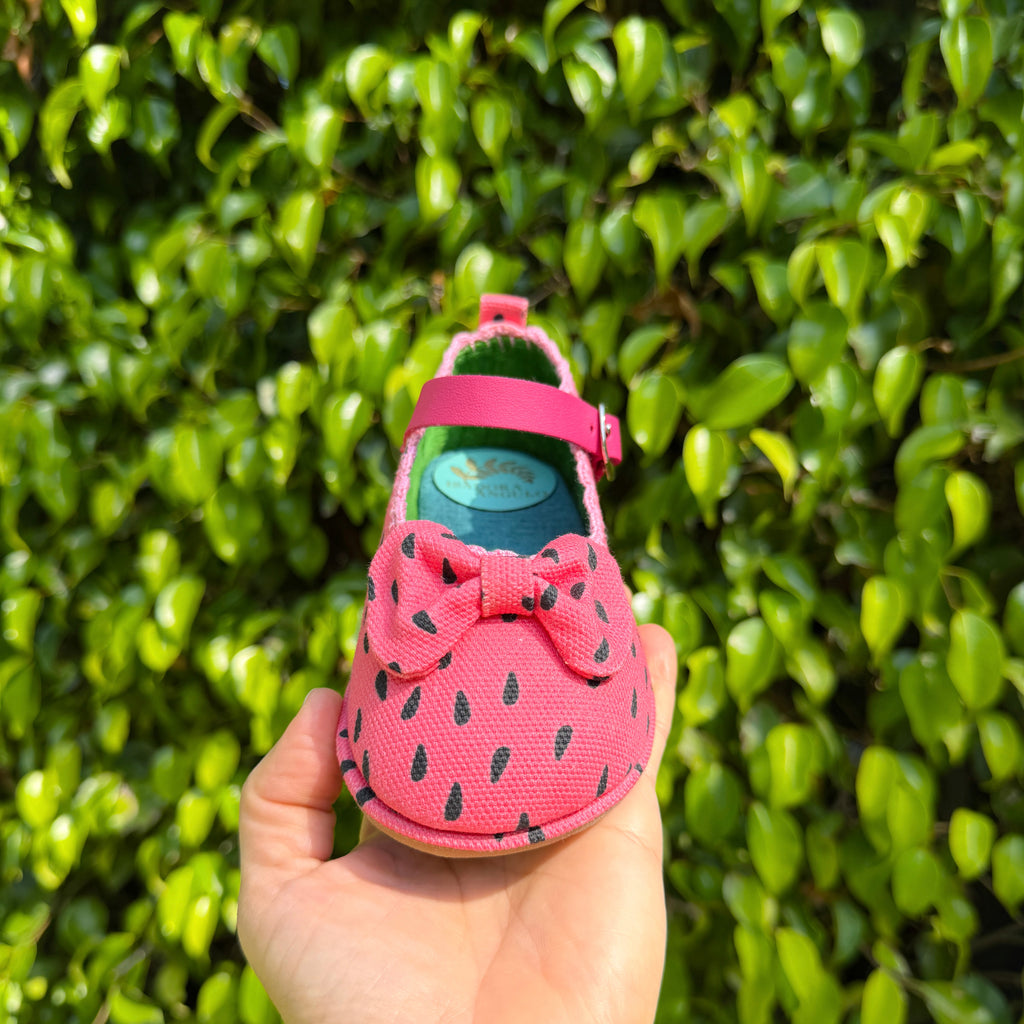 Handmade with love, these adorable toddler and little girl shoes are crafted for comfort and fun. Featuring a flexible sole that supports natural movement and healthy foot development, they’re designed in a cheerful watermelon-inspired cotton fabric with a matching bow and adjustable pink strap.