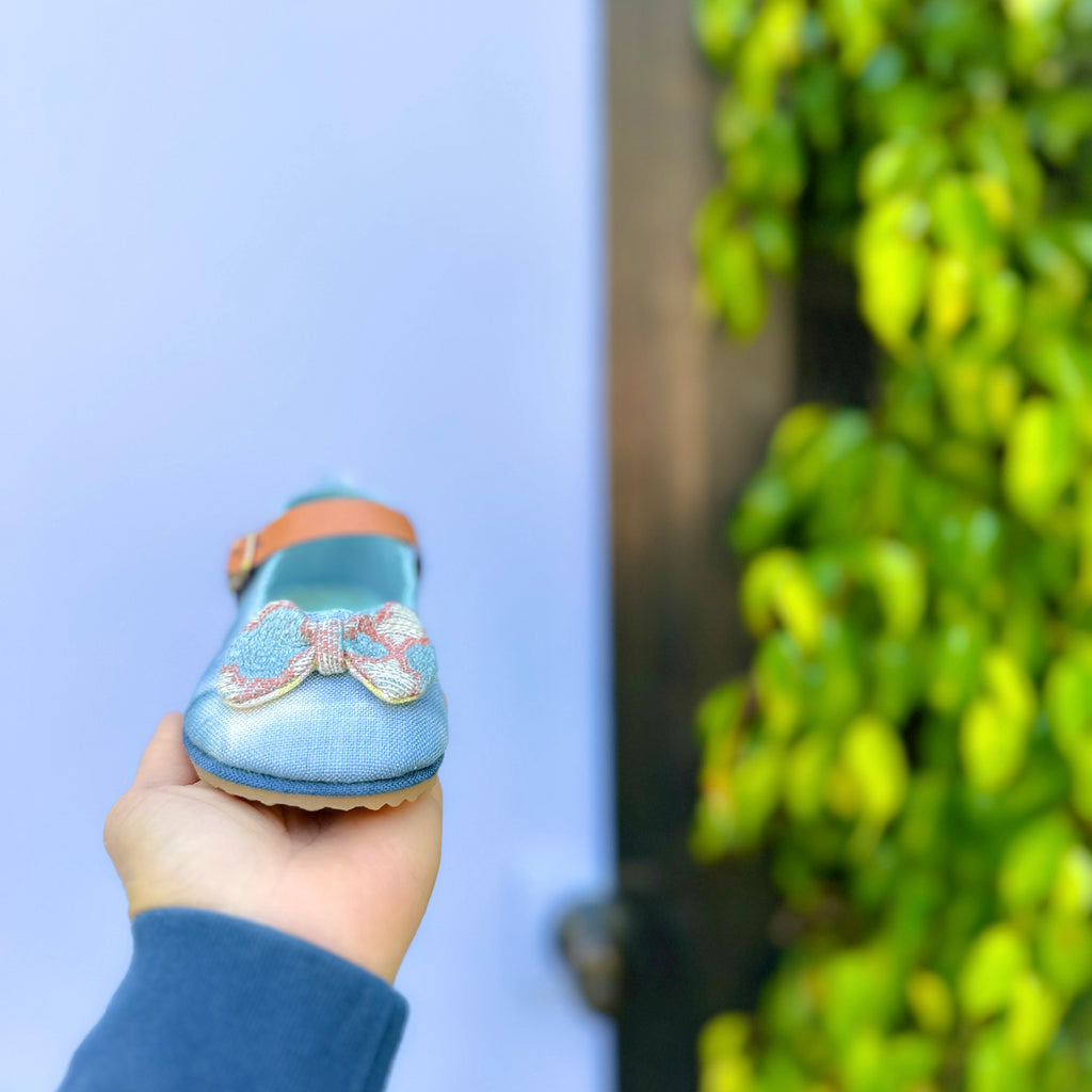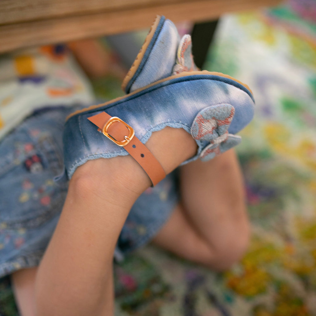 These adorable handmade shoes for toddlers and little girls are crafted with comfort in mind. Featuring a flexible sole that supports natural foot movement and healthy development, they’re finished in charming blue tie-dye linen fabric with a light brown leather strap and a sweet decorative bow.