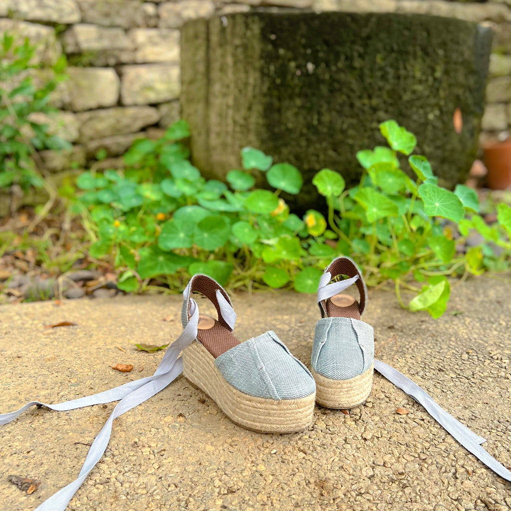 Handmade natural high heel platform espadrilles soles with pleats in the upper gray linen fabric, comfy and stylish look.