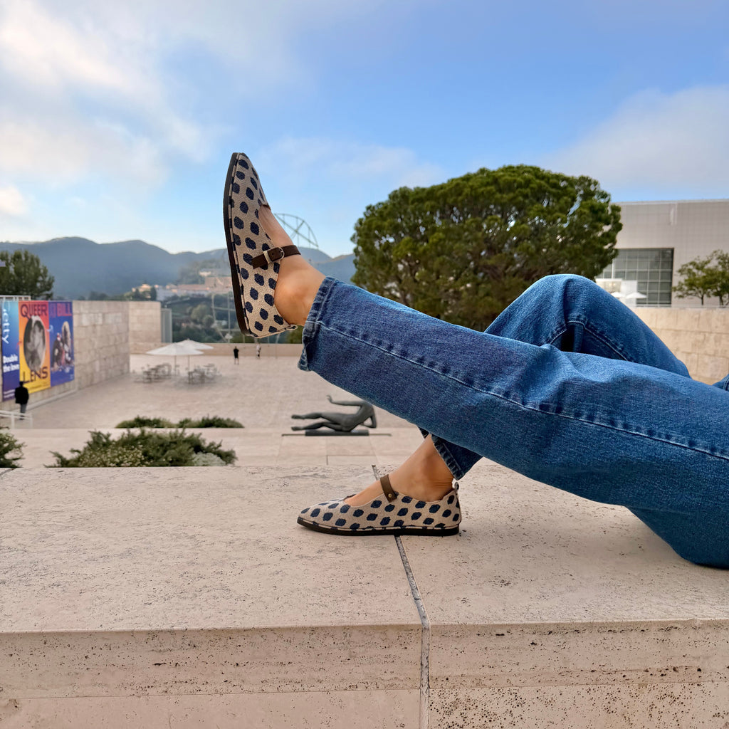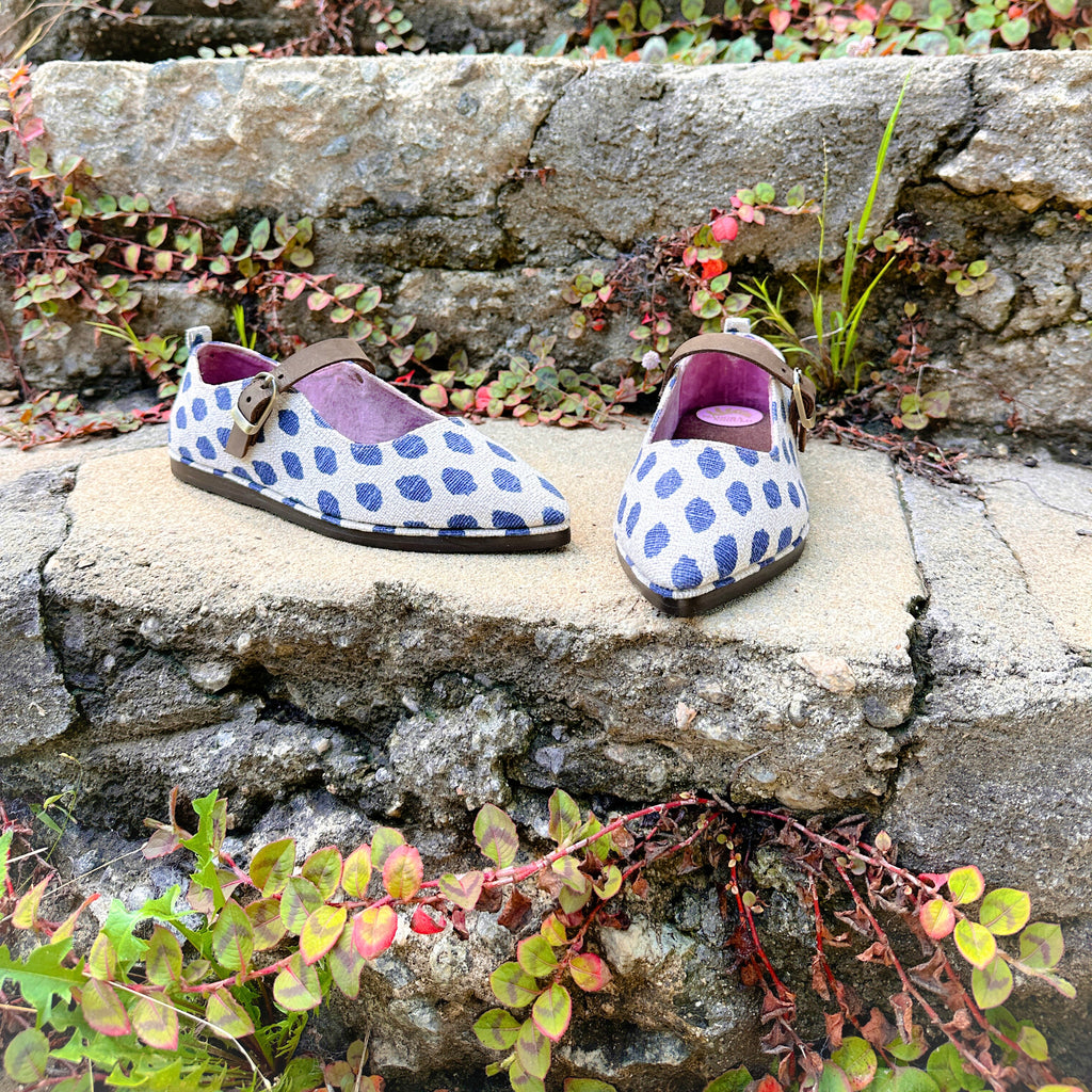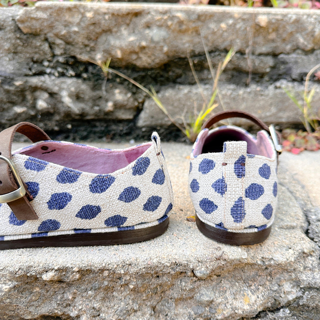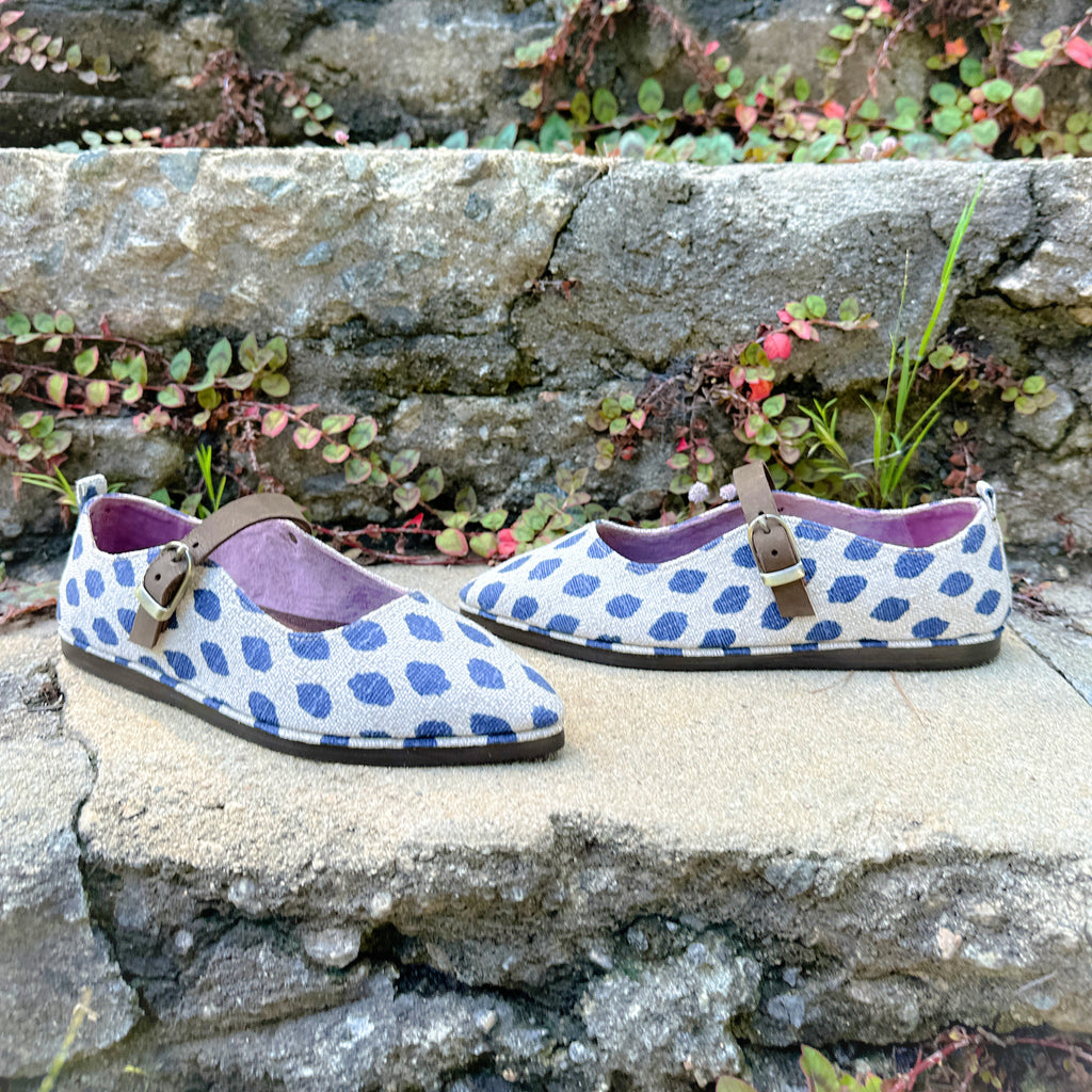 Handmade with love, these artisan Mary Janes are part of my sustainable shoe brand — created for elegance, comfort, and everyday wear. Featuring a cotton upper with a playful polka-dot effect, a dark leather strap, and a durable leather sole with antislip design, they blend timeless charm with practicality.